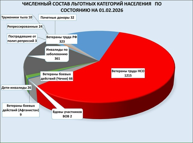 Из них наибольшую численность составляют «Ветераны труда Новосибирской области» — 1215 человек, «инвалиды по заболеванию» — 361, «дети инвалиды» — 26. Наименьший численный состав льготных категорий составляет: «Вдовы участников ВОВ» (жены умерших участников ВОВ) — 2 человека, «пострадавшие от политических репрессий» — 3 человека.