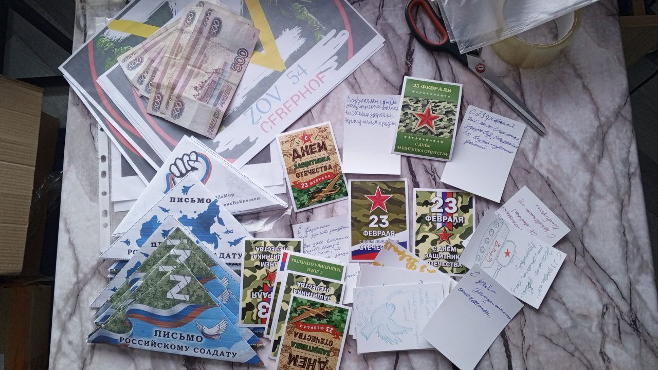 Параллельно идет сбор подарков ко Дню защитника Отечества. К сбору присоединяются и школьники. Ребята пишут трогательные слова поддержки и поздравлений с праздником.