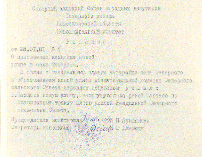 Согласно официальному документу, хранящемуся в архиве, «в связи с генеральным планом застройки села Северного и образованием новой улицы исполнительный комитет Северного сельского Совета народных депутатов решил: назвать новую улицу, находящуюся за рекой Тартасс по Биазинскому тракту влево улицей Раздольной Северного сельского совета».