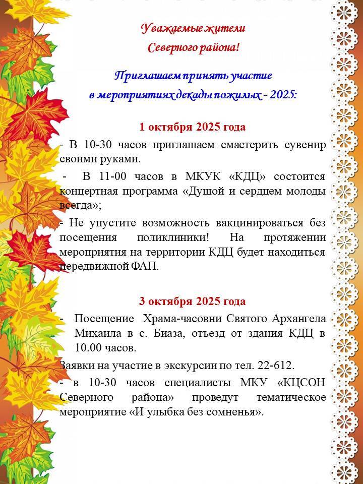 Уважаемые жители Северного района! 1 октября стартует декада мудрых. Организаторы приглашают вас принять участие в мероприятиях.