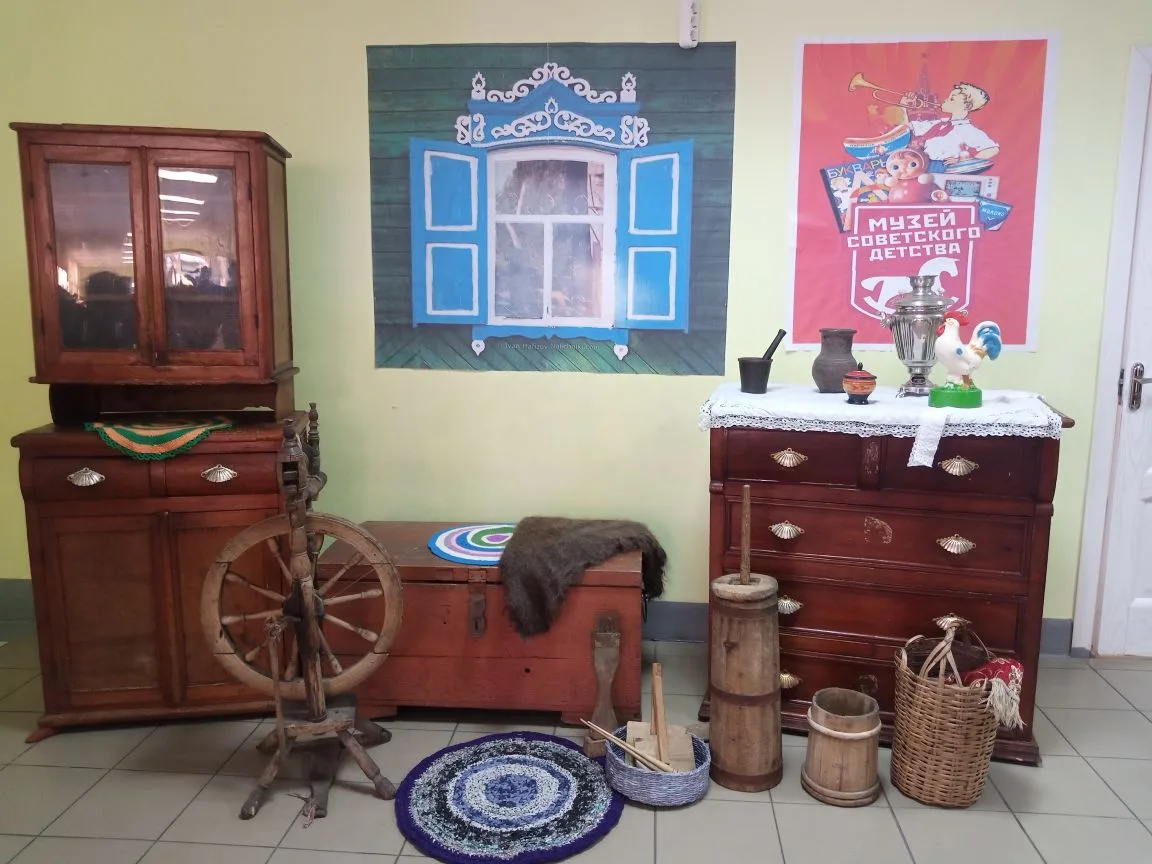 «Наши школьники и их родители заинтересовались идеей создания музея, и приняли активное участие в сборе экспонатов. Здесь представлены: магнитофон, который играл на танцах у бабушки; проигрыватель с виниловыми пластинками; старые граненые стаканы и фужеры, которые нашли свое место в настоящем старинном буфете; фотоаппараты, фильмоскопы прошлого века, диафильмы; игрушки; старые дисковые телефоны со справочниками телефонных номеров; книги советского времени; значки, открытки, марки; елочные игрушки, настоящая прялка, сундук, кресло, скатерти, домотканые коврики и многое другое», — рассказывает Татьяна Геннадьевна.