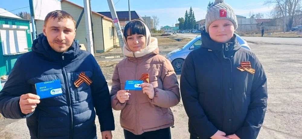 Участники акции раздавали Георгиевские ленты жителям села, желали мирного неба и напоминали: «Это наша память. Её нельзя порвать».